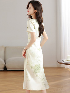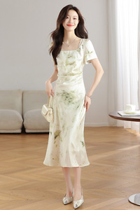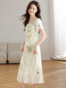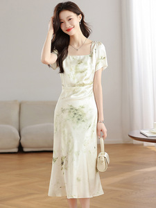 スクエアネックマルベリーシルクプリントドレス夏の気質ウエスト痩身Aラインスカートフレンチエレガントな文学スタイルロングスカート