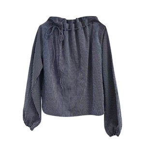 [二重層] フレンチブルー縦ストライプ長袖シャツ女性用秋の新デザイン巾着ストラッププリーツ