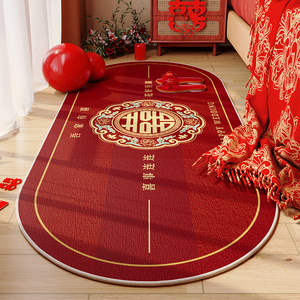 結婚式のベッドサイドマット楕円形の結婚式の部屋のレイアウト滑り止めフットマット結婚式の赤いお祝いの装飾ハッピーキャラクターカーペット