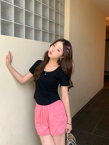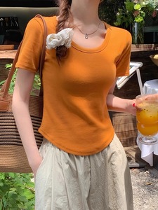 カボチャカラードーパミンウェアカーブヘムレディーススリム夏新作半袖Tシャツスリムショートトップイン