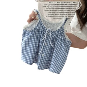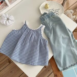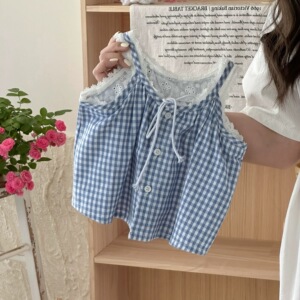 2025 新しい夏の女の子のファッショナブルなレースチェック柄サスペンダーベビーガールファッショナブルで甘いノースリーブトップ