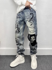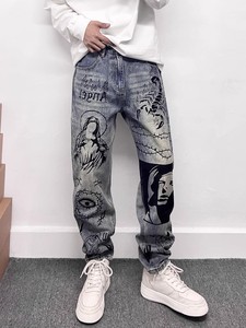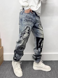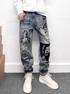 トレンディなブランドのハイエンドレトロブルーマイクロダメージジーンズメンズアメリカンハイストリートグラフィティプリントルーズストレートロングパンツ