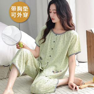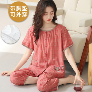 2025 新しいスタイルの女性のための胸パッド付きパジャマ夏半袖クロップドパンツ 2 点セットラウンドネックカーディガンチェック柄ホーム服
