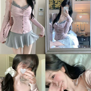 ピンクのトップスとグレーのボトムスカートの3点セット