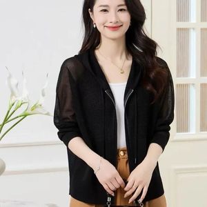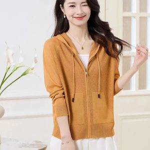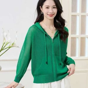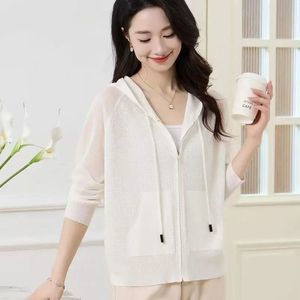 春夏の女性用フード付きアイスシルクニットカーディガン、薄手のショート長袖日焼け止め服、韓国風ルーズショールジャケット