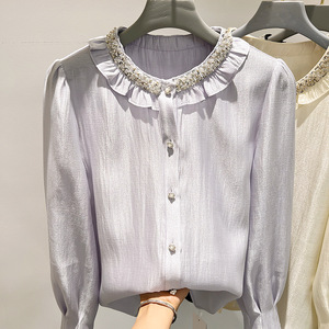 2025 新韓国スタイルラウンドネックスパンコールビーズシングルブレスト長袖シフォンシャツ女性の夏と秋