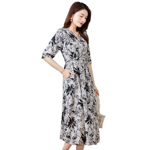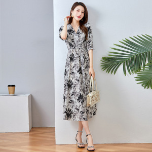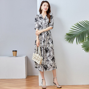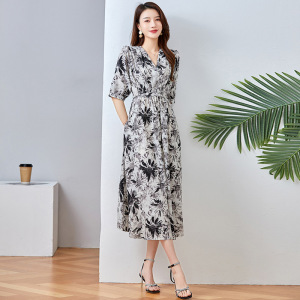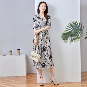 水墨画風のシルクワンピース、おしゃれなウエストマーク、エレガントなロングドレス、フレンチスタイルの高級感、通気性があり快適なハイウエストAラインスカート