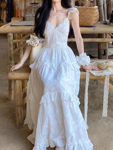 《ツバキの白い月光》vネックのサスペンダーのワンピースの女性の夏の露背のアンドロメダのロングスカート