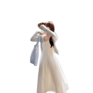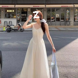 フレンチジェントルスタイルレースVネックホワイトサスペンダードレスレディースウエスト気質海辺休暇Aラインロングスカート