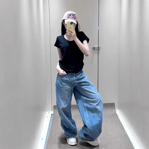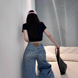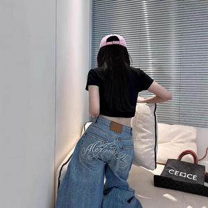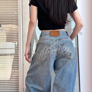 ヘビーデューティーレターホットダイヤモンドワイドレッグスモールソードジーンズ女性用夏の新しいデザインルーズストレートレッグフロアレングスワイドレッグパンツ