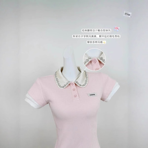 SunsetPark サンセットパーク ピンク ブルー グレー スプライシング フェイク ツーピース ポロ ラインストーン カラー 半袖 ストレッチ Tシャツ トップ