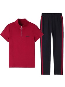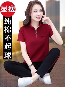 マルーンコットンスタンドカラー半袖スーツ女性用2025新作夏中年ママスポーツウェアズボン2点セット
