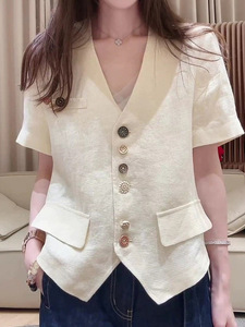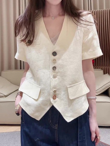 フランスのレトロな小香風vネック半袖シャツ女性2025夏の新型高級デザイン感カジュアル上着ブーム