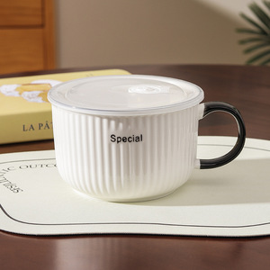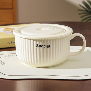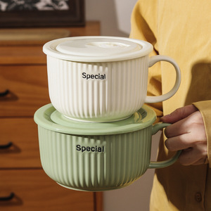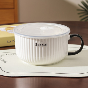 クリーム風セラミックインスタントラーメンボウル家庭用蓋付き鮮度保持丼電子レンジ対応学生ハンドルボウル仕事弁当箱