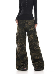 アメリカンレトロなウォッシュデザインの男性と女性のための迷彩ジーンズ、ルーズストレートマルチポケットワイドレッグワークカジュアルパンツ