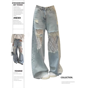 プラスサイズファットmmヘビーデューティーレースメッシュリップドジーンズ女性の夏の新しいスリムルーズストレートワイドレッグパンツ