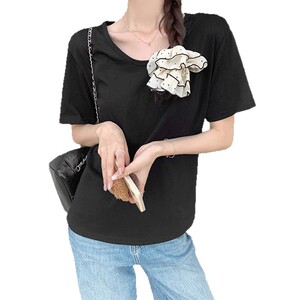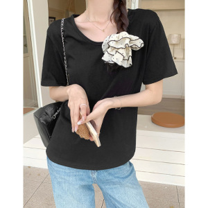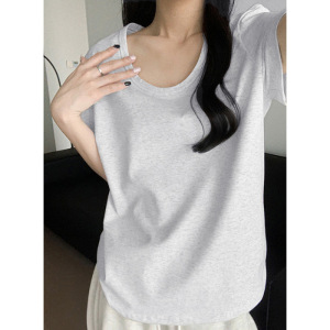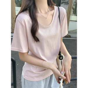 跨境一件代发夏季40支双纱粉色U领大码宽松慵懒半袖正肩T恤女上衣