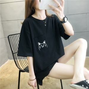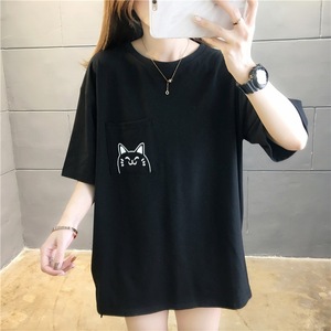ミドル丈ゆったり夏イントレンドゆったりスリット韓国風ポケット猫半袖Tシャツおしゃれで万能なイントレンド