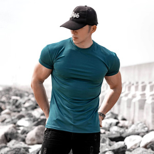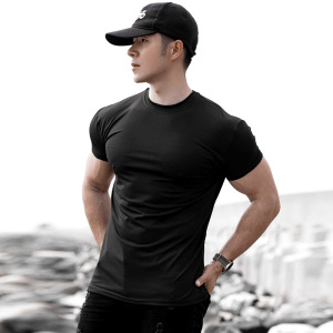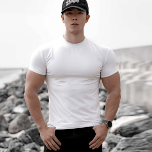 スポーツ用伸縮性半袖メンズTシャツ 夏用 無地 マッスルラウンドネック 速乾性 通気性 フィットネスウェア 冷感 通気性