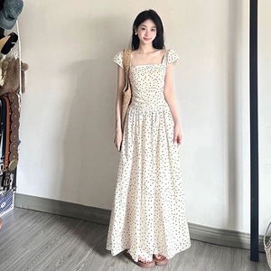 フレンチスクエアカラーオフホワイトガーリードレスレディース夏新作スリムフェアリードットロングスカート