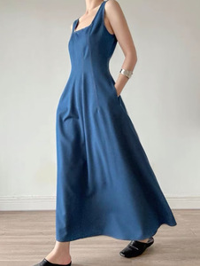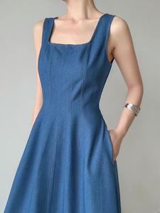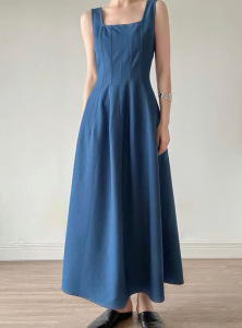 2025 新しい夏ブルーミストラブデニムドレスフレンチスタイルブルーサスペンダーロングスカートウエスト痩身