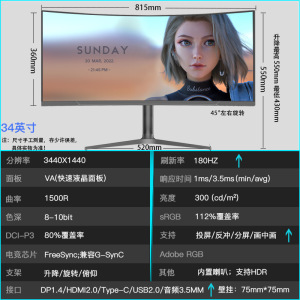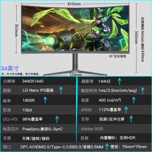 34インチ 4K [NanoIPSLG 曲面スクリーン 100HZ] 昇降・回転分割画面/Typec投影