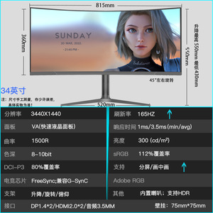 34インチ 4K [HVA大型曲面スクリーン 165HZ] 昇降・回転 ブラック/分割スクリーン/内蔵
