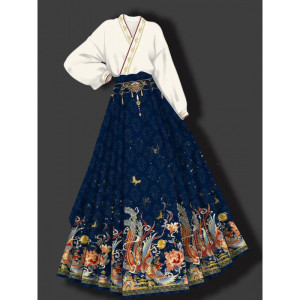 白シャツ+青馬スカート中華風スーツ