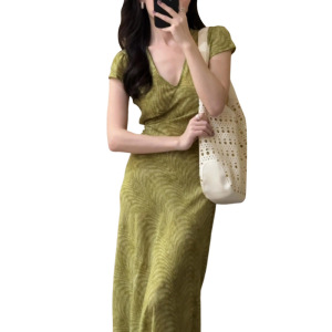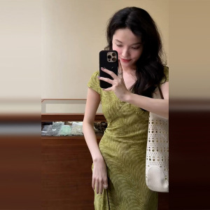 フレンチ V ネックグリーン花柄ドレス女性のための夏 2025 新しい海辺の休暇気質ウエストカバーヒップロングスカート