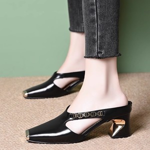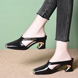 フレンチハーフスリッパ女性のソフトレザーつま先 2025 新しい夏のスクエアトゥフラットミュールレトロアウターサンダル