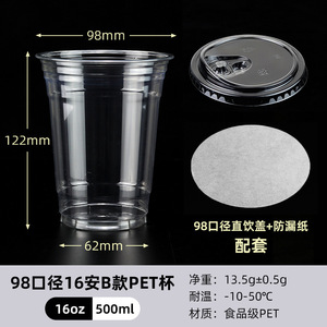 98-16オンス (500ml) カップ + 平らな蓋 + 漏れ防止紙 + ステッカー + ストロー