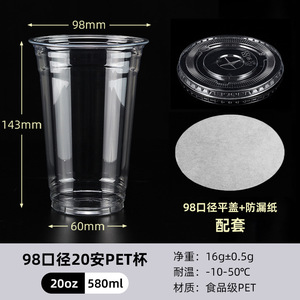 98-20オンス (600ml) カップ + 平らな蓋 + 漏れ防止紙