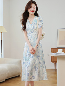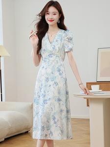 ブルーのパフスリーブ花柄スカート、ウエストウエストスタイル、シルクAラインスカート、ファッショナブルでエレガントなVネックドレス