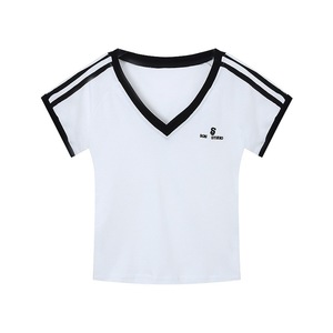 純綿アメリカン V ネックショルダージャージ半袖 Tシャツ女性の夏の新しいウエスト痩身ホットガールスリムトップイン