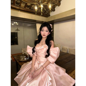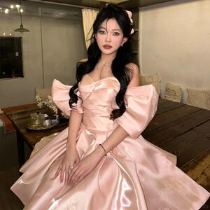 フレンチライトラグジュアリー大人ドレスデザイン気質ショート宴会誕生日パーティーワンショルダーピンクプリンセスドレス