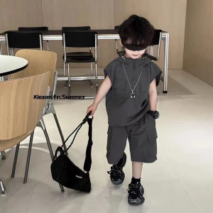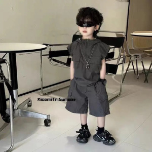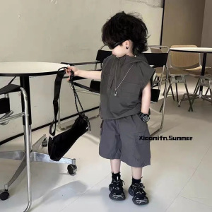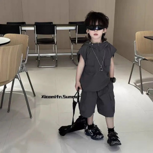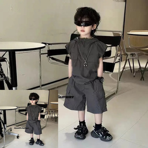 男の子夏無地カジュアルスタイルツーピースセット2025新作ハンサムで多用途なフード付き半袖スーツ小中型子供用