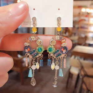 ダイヤモンドとパールタッセル付きスチールニードルイヤリング、絶妙な気質、エスニックスタイルイヤリング、ニッチな軽い高級感、女性向けの多用途イヤリング卸売