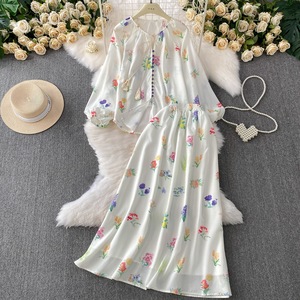 フレンチスイートフローラルレースアップシングルブレストラウンドネックランタンスリーブシャツ+ハイウエストスリムスカートツーピーススーツ