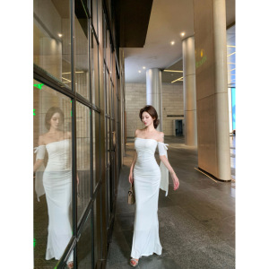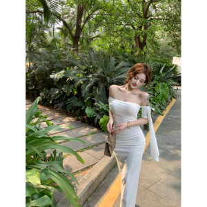 【ビンゴ】+シャヘ25春ワンショルダーリボンニットワンピースレディース夏ウエストカバーヒップロングスカート