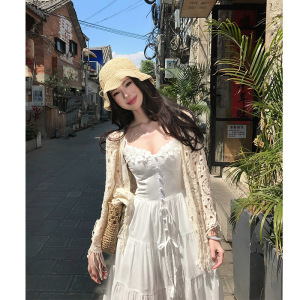 在庫あり、女性用フレンチサスペンダードレス、夏の初恋、白いドレス、雲南新疆海辺の休暇ドレス、ロングドレス