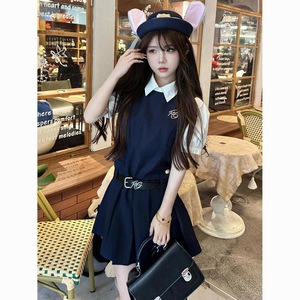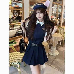 两件/套装学院风甜美设计感高腰百褶无袖连衣裙子女学生+白色衬衫