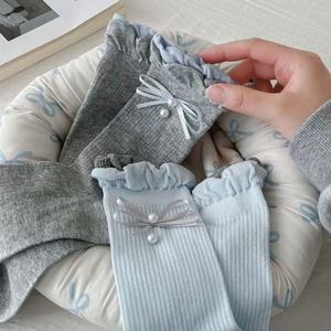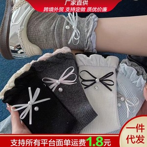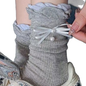 夏用薄手レディース韓国風スイート立体フラワー和風パール無地リボンソックス、女性用カールエッジパイルソックス