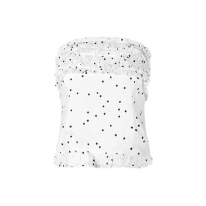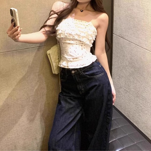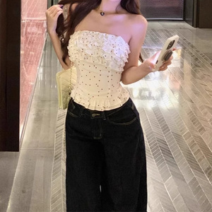 女性用耳介水玉模様の美しいバックチューブトップ、夏用スリムウエストノースリーブアウターウェアホワイトショートスイート&スパイシートップ