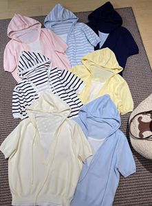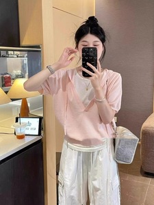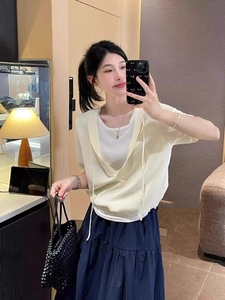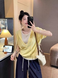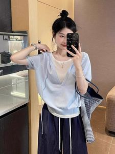 2025 新しい美しいブルー偽ツーピースフード付きニットショートトップ女性の夏の半袖右肩 Tシャツ