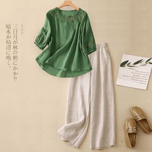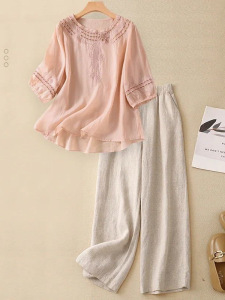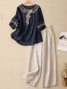 エスニックスタイルの新しい中国風半袖ファッションスーツツーピースコットンとリネントップ文学レトロカジュアル気質ワイドレッグパンツ