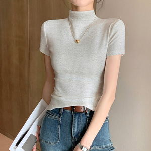 女性用ハーフタートルネック半袖ボトムシャツ、春夏秋の薄手の純綿Tシャツ、スリムフィットシャツ、気質半袖トップス