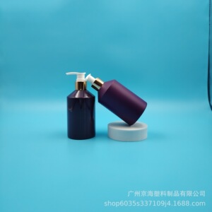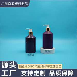 工場でカスタマイズされた250ml斜め肩平底マットパープルプラスチックボトル、シャンプー・ボディソープボトル、プレス式ポンプヘッド