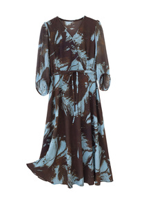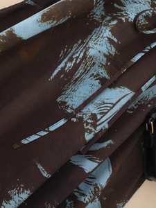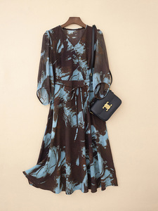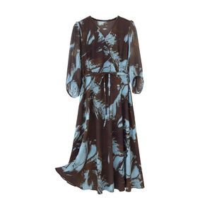 マルチカラーの夏のレトロツイル、シンプルで多用途、ミドル丈のスカート、クレープデシンプリントのウエスト痩身ドレス