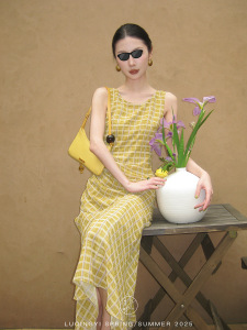 Lu Qingyi [Ye Qingzhou] レトロチェック柄ノースリーブドレスレディース夏シフォンプリントベストロングスカート