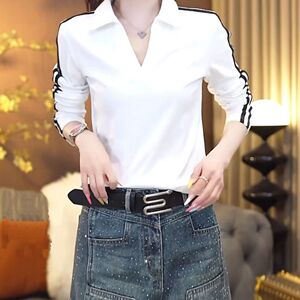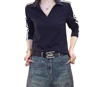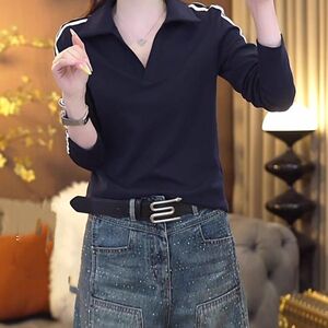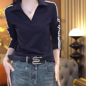 大码高级感条纹V领打底衫女2025早春洋气时尚百搭显瘦翻领长袖T恤